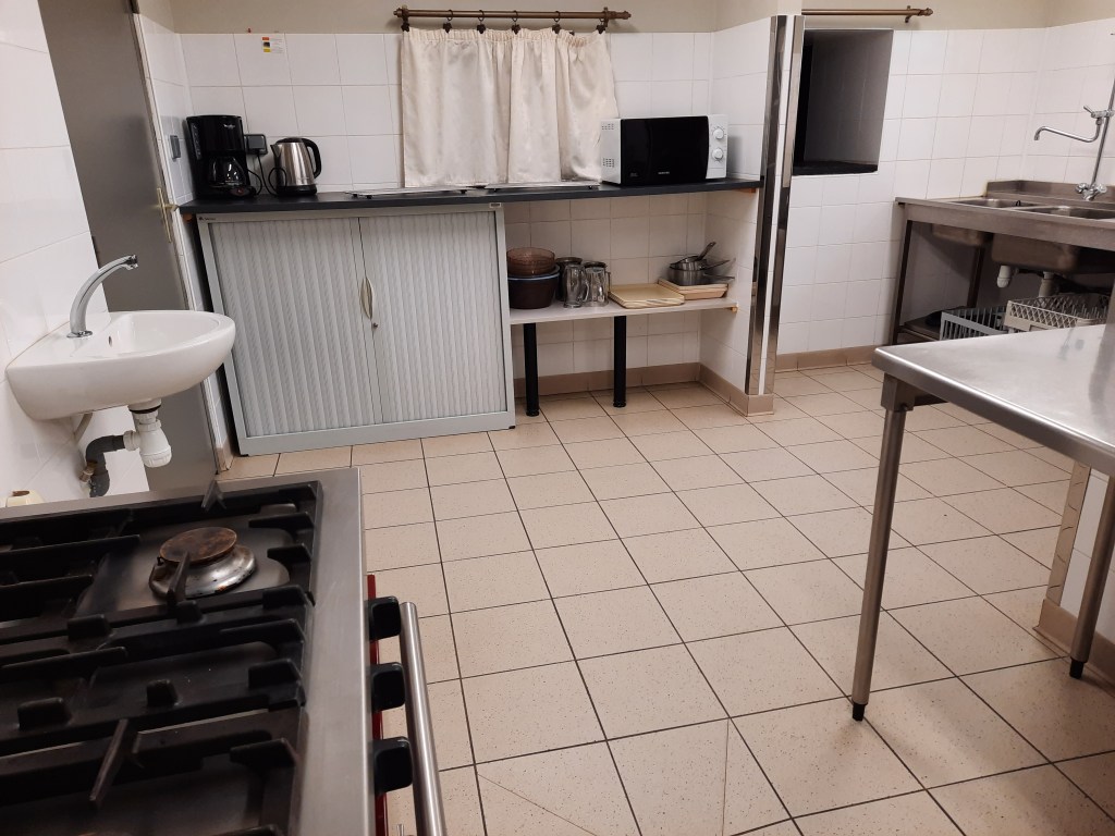 Equipée d’un grand frigo, un petit congélateur, une gazinière piano, une plonge et un lave-vaisselle.